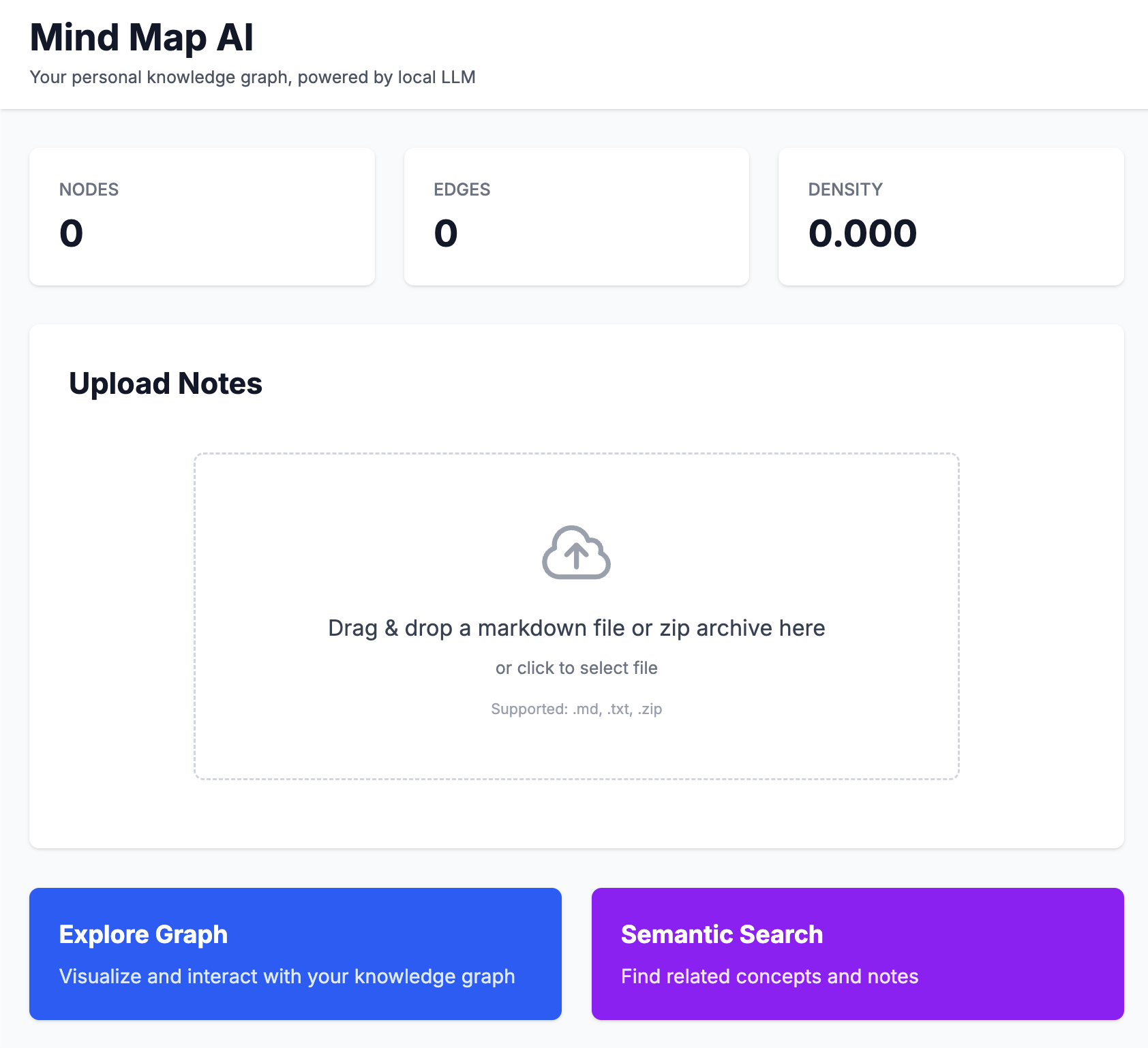 Project: Mind Map AI — LLM-powered Personal Knowledge Graph (All Local) Target: Local-only stack (Next.js frontend, FastAPI backend, local LLM, SQLite, NetworkX graph). Purpose: Convert notes/journals/markdown into a browsable, queryable, and editable knowledge graph; provide semantic search and visualization; all inference and storage stays local.